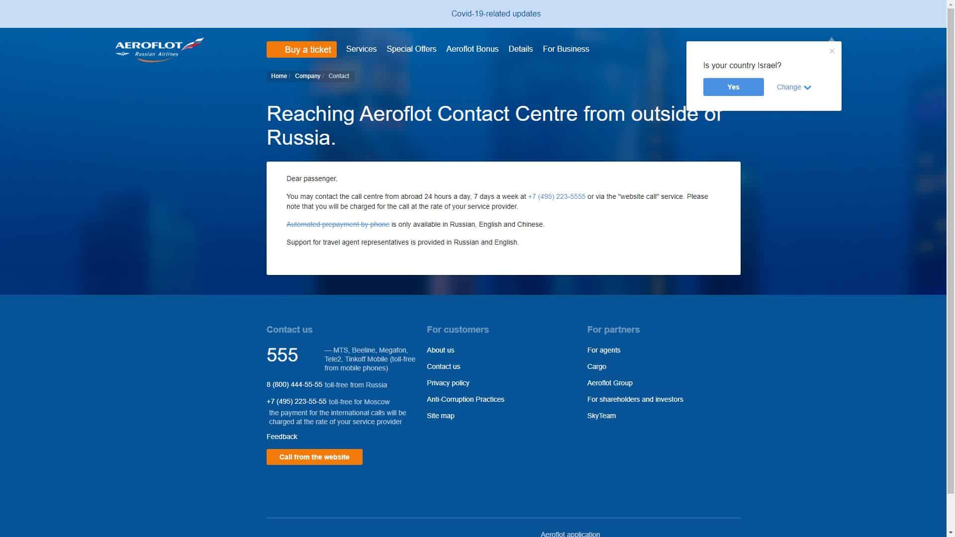אירופלוט – Aeroflot – שירות לקוחות – אתר אינטרנט