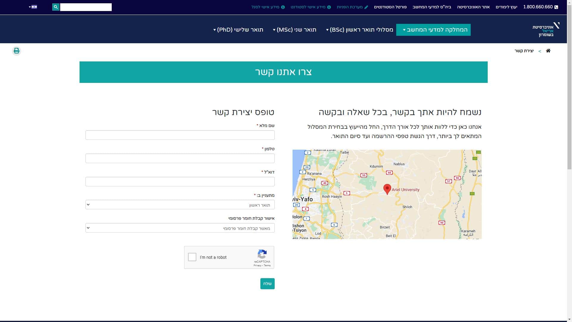 אוניברסיטת אריאל טופס יצירת קשר צילום מסך
