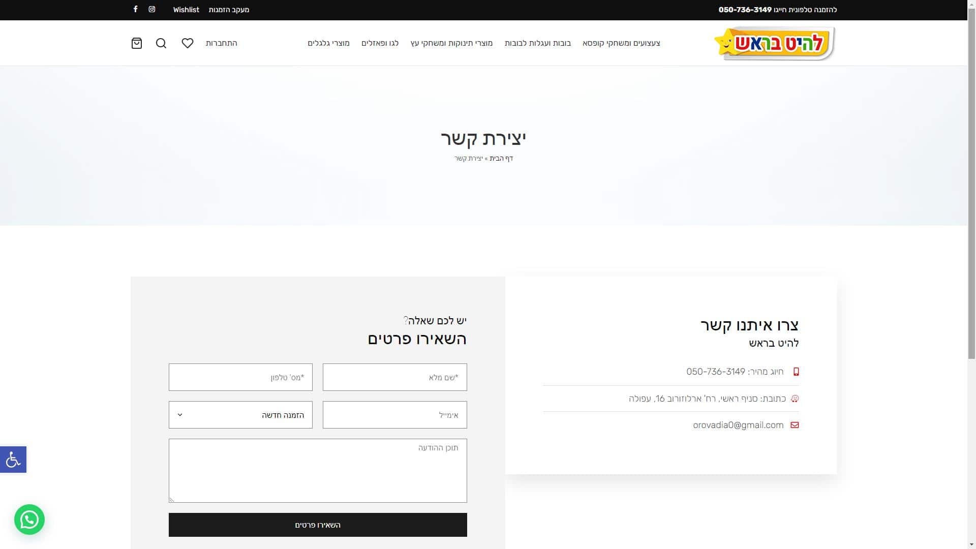ריכזנו כאן את כל הפרטים אשר פורסמו ליצירת קשר עם שירות הלקוחות של להיט בראש – מוקד טלפוני, כתובת דוא"ל, חשבונות מדיה חברתית, אתר האינטרנט של רשת להיט בראש ועוד. להיט בראש מוכרות בסניפי הרשת מגוון של משחקים וצעצועים, מוצרי ספורט, משחקי יצירה ואופנה, כלי עבודה לילדים, כלי תחבורה לילדים ועוד.