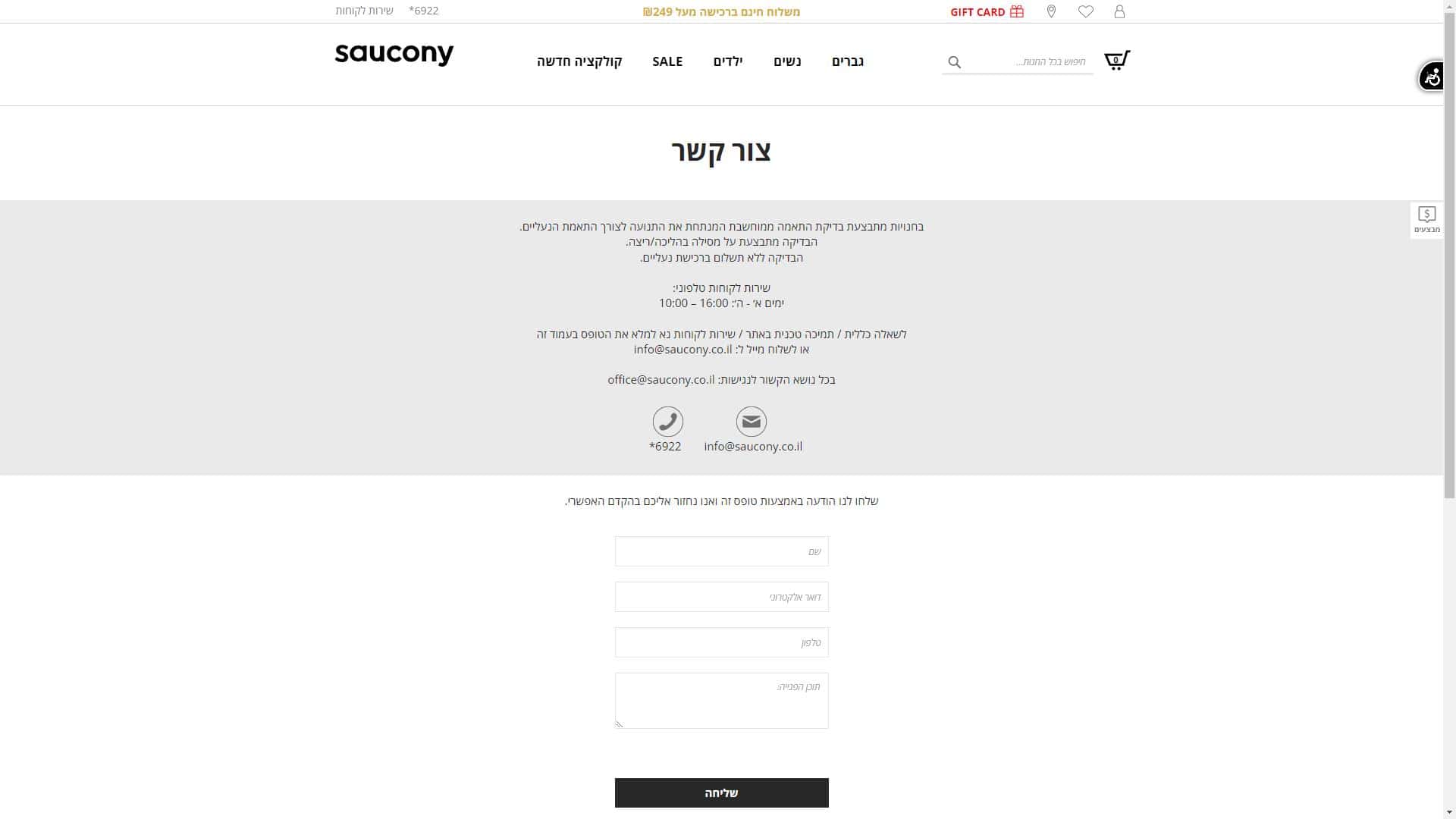 שירות לקוחות סאקוני – כתובת דואר אלקטרוני: info@saucony.co.il.